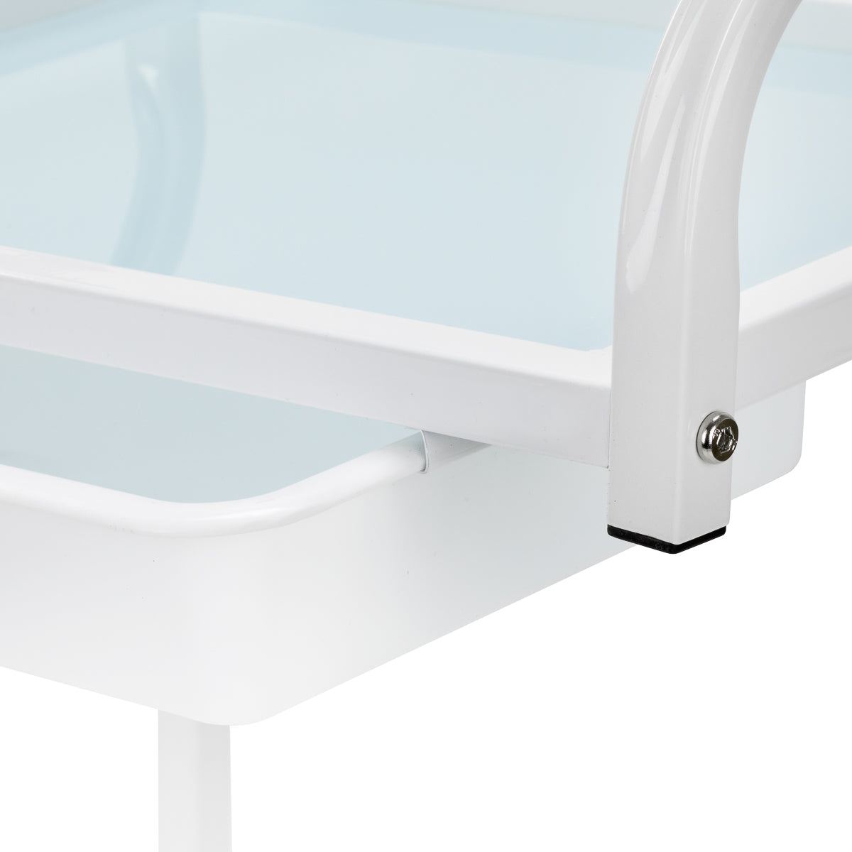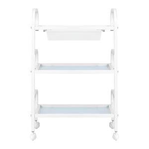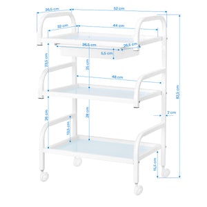 The frame made of durable aluminum in shades of white and the glass shelves create a modern and aesthetic whole that is easy to keep clean. Four wheels ensure mobility for easy organisation of the workspace, while solid materials guarantee stability and durability of use.