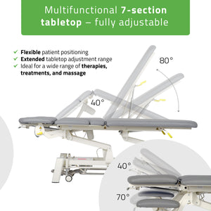 PROXIMA X7 is a premium-class professional electric rehabilitation table designed for intensive use in physiotherapy clinics, rehabilitation centers, and massage studios. With its 7-section tabletop, advanced electric adjustment features, and ergonomic solutions, this model ensures safety, maximum patient comfort, and optimal working conditions tailored to the therapist's individual needs.