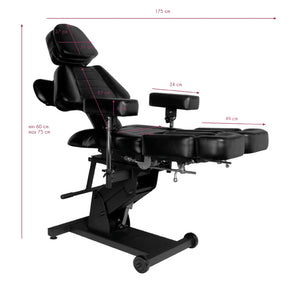 very advanced, adjustable in many planes (height and backrest adjustable with a foot remote), with unlimited possibilities of settings ensuring comfort for both the artist and the tattooed person.