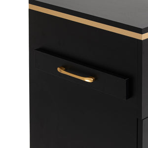The Gabbiano 2027G hairdresser's helper is an elegant piece of equipment which will emphasise the character of a professional interior and improve everyday work organisation. The furniture is distinguished by a minimalist form in shades of black with gold details, which gives it a unique, luxurious look.