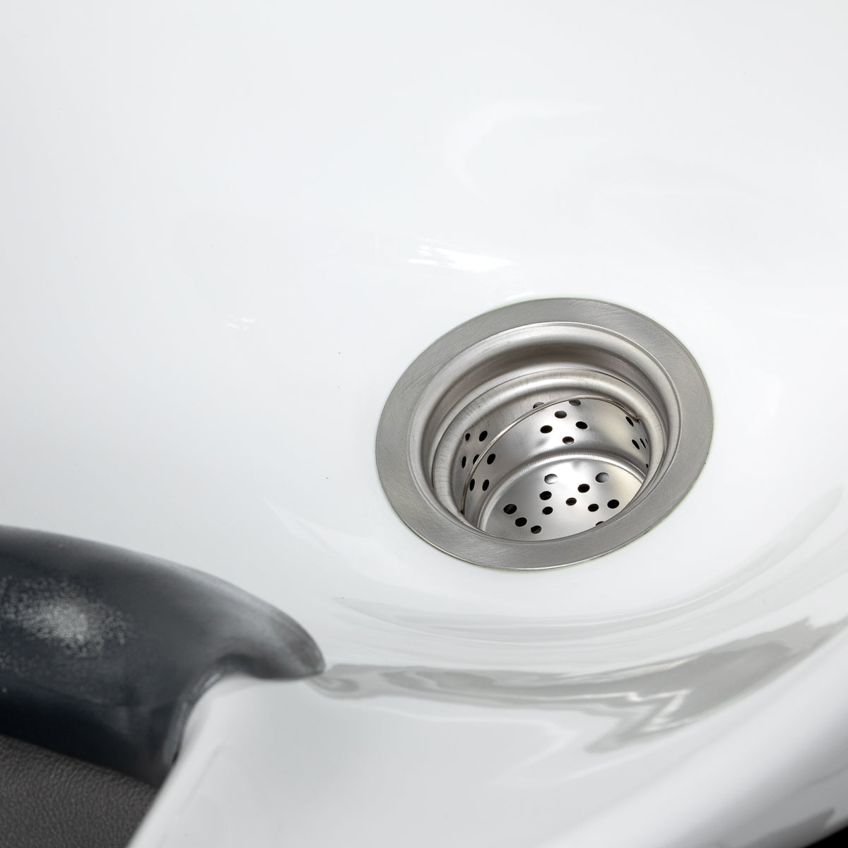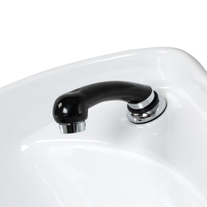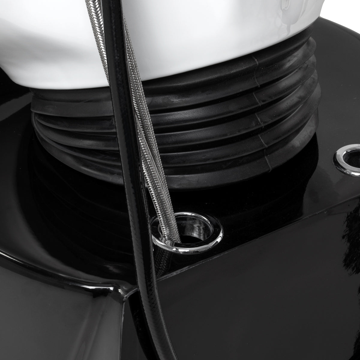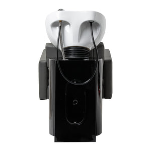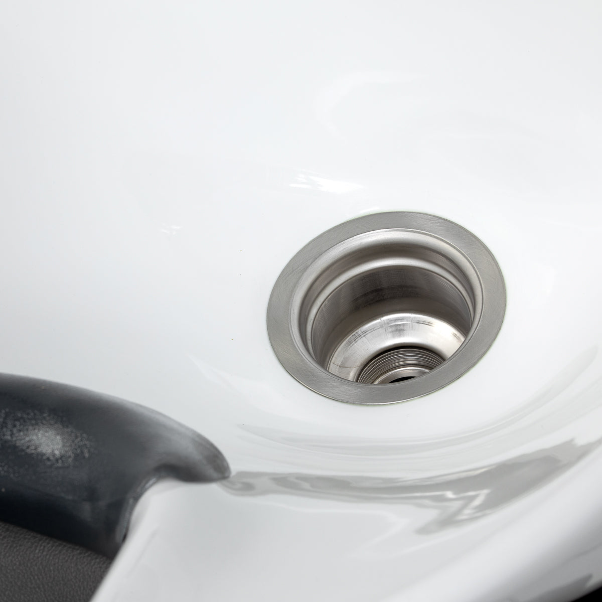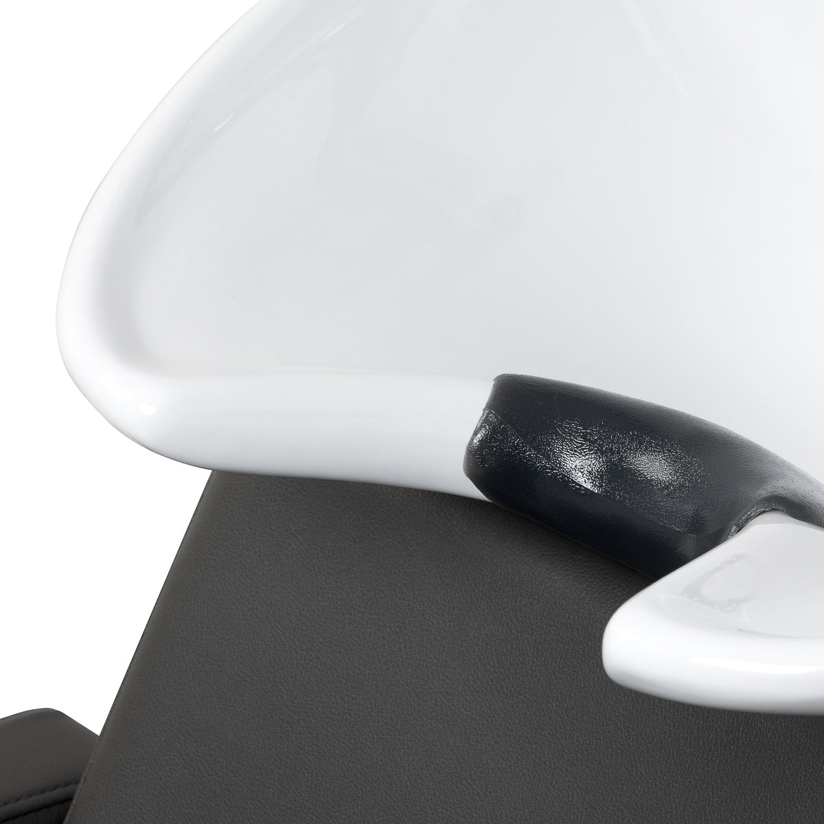 The deep ceramic bowl in shades of white effectively reduces splashing of water and preparations used during treatments. This promotes comfortable and precise performance of various hairdressing services. The movable construction of the bowl allows for easy adjustment of the angle of inclination to individual needs. The material used is durable, resistant to discolouration and scratches, and easy to keep clean. The appropriately profiled collar provides comfortable head support during washing, while the comfortable plastic cover in shades of black eliminates the feeling of coldness of the ceramic surface.