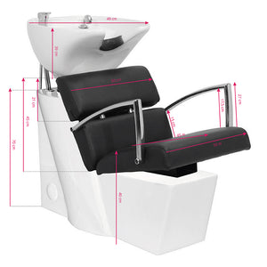 professional hairdressing washer - stable, extremely comfortable, solidly constructed. modern design makes it a beautiful complement to the equipment of a modern hairdressing salon. seat made of high-quality brown eco-leather. the silicone head pad stabilizes the client's head and allows it to be conveniently placed on the washer. white myki bowl, with the possibility of adjusting its inclination. black car wash