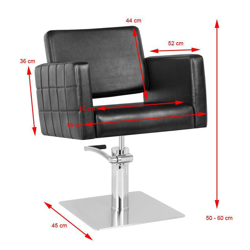 A solid, flat, square base ensures stability during use. The smooth surface with a mirror finish gives the element an elegant look and makes it easy to keep clean. A comfortable seat filled with durable foam ensures high comfort of use, even during many hours of treatments. Upholstered with synthetic leather with decorative stitching armrests are a visually interesting element, and more importantly, they allow the customer's shoulders to be positioned correctly. This means that he does not bury his head in his shoulders or slouch – this clearly makes it easier to perform precise procedures, including haircuts. Equipping the chair with a full rotation mechanism makes the hairdresser's work more effective and comfortable.