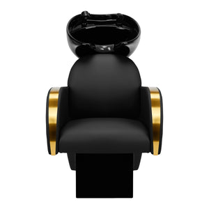 A properly profiled chair filled with durable foam ensures high comfort of use and elegant armrests allow for the correct positioning of the client's shoulders. The backrest is placed at an optimal angle to allow you to take the right position and promote excellent spine support. Coverage in shades of black and decorative metal surfaces lacquered in gold colors give it a timeless elegance and in addition guarantees long-term durability and ease of cleaning. Distinctive hair wash unit classic finish makes it look great in almost any space. The set includes complete fittings in shades of black, including a faucet, shower head and dedicated hoses to provide a complete set of tools for work.