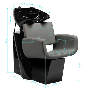This minimalist chair with a distinctively rounded seat combines simple form with high comfort. The backrest, with its optimal tilt angle, supports a natural body position. The upholstery, made of high-quality synthetic leather in shades of grey, is resistant and easy to clean. The modern design of the furniture emphasises the elegant character of the wash unit and perfectly complements the salon's décor. The set includes a complete set of fittings with a matte finish in shades of black, including a faucet, shower head, and matching hoses, providing a complete set of tools for work.