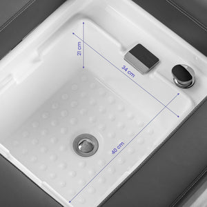 The wash unit is equipped with a mixer tap, allowing for easy temperature adjustment to the customer's preferences. A practical place for the shower head facilitates work, while a plug with a special strainer allows for water flow control and maintaining high hygiene standards in the salon. The water connection is located inside under the bowl and at the back under the shower tray aesthetically concealing the installation. The ergonomically contoured lounger provides comfort and adequate support during treatments, and the included pouffe enhances staff comfort. The combination of functionality and convenience makes this wash station a versatile piece of equipment for both hair salons and SPA parlours.