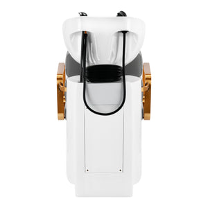 The practical hair wash unit is equipped with a mixer faucet, which provides easy access to hot and cold water. This makes it easier to adjust the temperature to the customer's individual preferences. A dedicated place to hang up the handset makes work easier, and the chrome-plated plug with a special strainer allows you to control the water flow and maintain high hygiene standards in the salon. The water connection has been placed inside the base, allowing the pipes to be easily hidden. A significant advantage of this model is the opening left between the backrest and the seat, which makes it easier to keep the living room clean by allowing you to easily sweep dirt from every nook and cranny of the chair. The hair wash unit has been designed in such a way as to ensure comfort during various treatments, ensuring proper back support. The combination of functionality and amenities makes working in a hairdressing salon even more comfortable.
