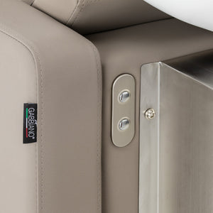 The Gabbiano Sylvia hairdressing wash station has been designed with the aim of comfortably performing care or colouring treatments in mind, as well as providing the client with a comfortable position during longer procedures. It catches the eye with its simplicity and geometric form, while the perpendicular lines of the seat and armrests give it a modern feel. The backrest placed at an optimal angle promotes excellent support for the spine. The appropriately profiled seat filled with durable foam ensures high comfort of use, and the upholstered armrests allow for the correct positioning of the client's shoulders. The synthetic leather cover in shades of beige guarantees many years of durability and ease of cleaning. The elegant, minimalist look of the wash station gives the interior a unique touch. The set includes complete fittings in shades of chrome, including a faucet, shower head and dedicated hoses to provide a complete set of tools for work.
