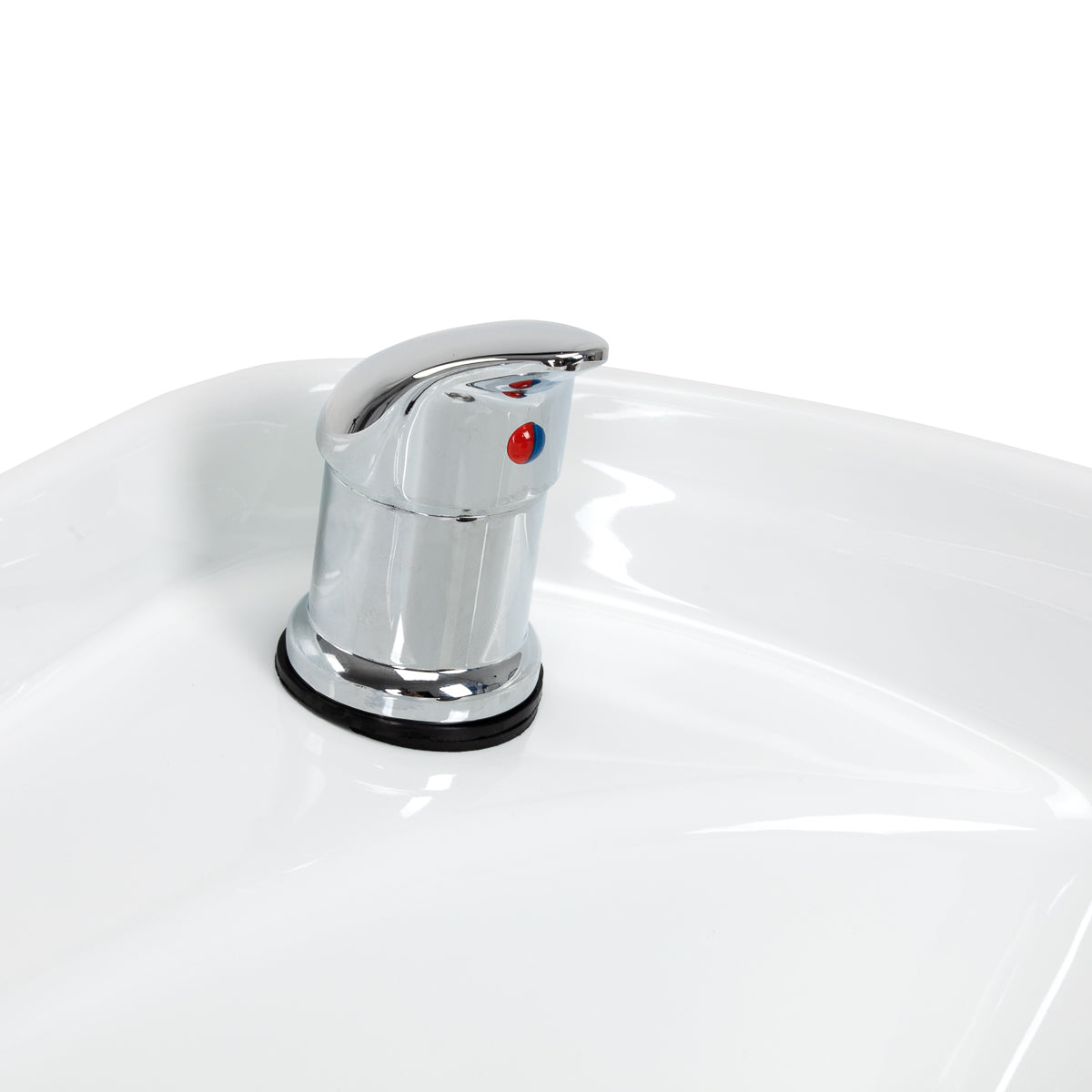 The depth of the ceramic washbasin bowl in shades of white allows for comfortable and efficient performance of a wide range of hairdressing services, preventing excessive splashing of water and products used during the treatment. The material used makes the washbasin durable, resistant to discoloration and scratches, and very easy to keep clean. The appropriately profiled collar and inclined backrest provide support and comfort while washing hair, and thanks to the comfortable plastic overlay in shades of black, the client will not feel discomfort from the cold ceramic surface.