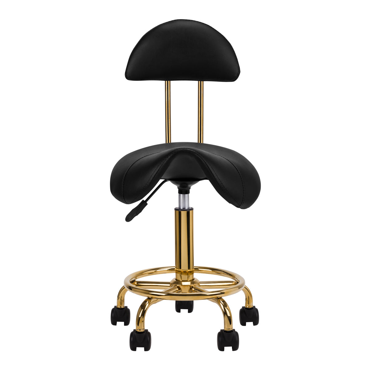Comfortable, stable cosmetic stool with a backrest, with a profiled seat, gold-colored metal elements. On a five-star base with plastic wheels. Available in white, a necessary piece of furniture in a beauty salon. Lacquered metal surfaces.