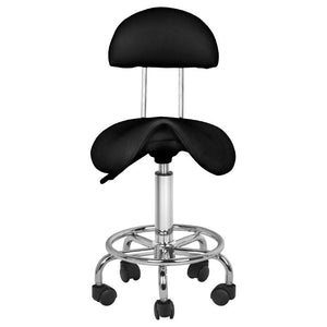a comfortable, stable cosmetic stool with a backrest, with a profiled seat, on a five-star base with plastic wheels. available in black, a necessary piece of furniture in a beauty salon.