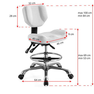 the newest model of a cosmetic stool. incredibly comfortable. regulation in three planes allows you to ideally optimize the position of the chair. next to the adjustment in the vertical plane, we can set the angle of the backrest and the seat angle. perfect for long hours of work. a hoop to support the legs above the footrests. the color of the armchair's upholstery is white.