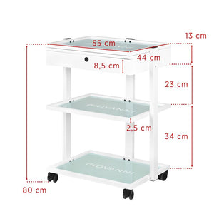 elegant metal and glass table, on rubber wheels. the table has a spacious drawer and two glass shelves with an engraved giovanni logo. it is possible to attach a lamp-magnifier to the table.