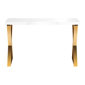 The high-gloss white top and geometric, golden legs give it lightness and a modern character. Thanks to its light form, the desk will work well in both intimate and spacious interiors, emphasizing their exclusive character. It is an excellent investment in aesthetics and comfort of daily work