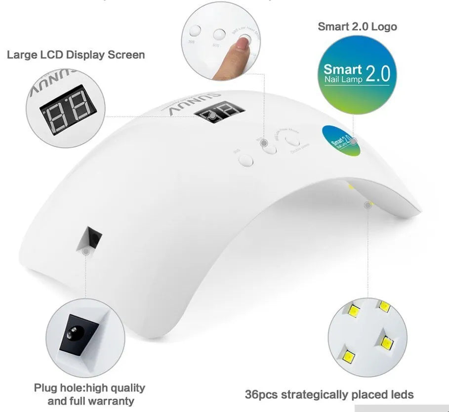 Compact new generation professional Smart nail dryer with smart painless builder/hard gel curing, smart double speed curing, smart time memory function, smart sensor, smart digital time display, smart over-temperature protection. Fashionable and durable 50000hrs lifetime, ideal for both home and salon use. This nail dryer can help you to solve almost all the curing problem!