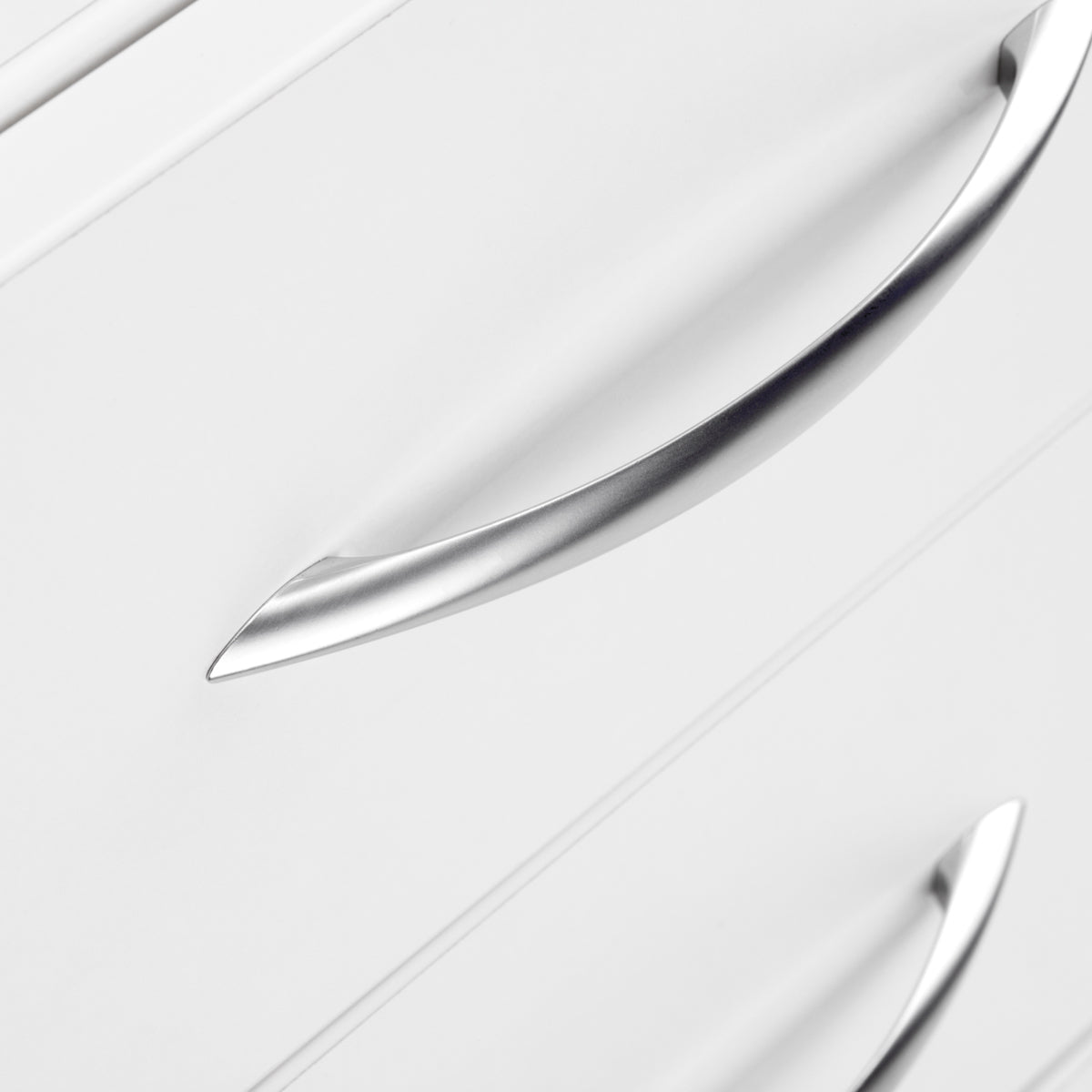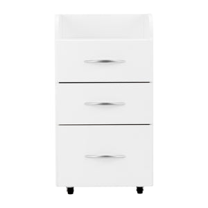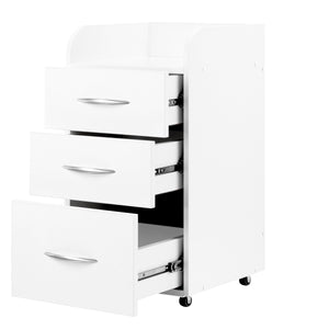 cabinet with 3 drawers on white roller guides. the cabinet has wheels installed, which allows it to be easily moved across the floor.