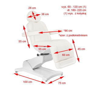 electric cosmetic chair, ideal for beauty salons and spa salons. thanks to independent motors, it allows to adjust the chair in 4 planes by means of a remote control, giving the possibility to perform facial and body treatments. The chair has an innovative solution that allows the seat to rotate 180 degrees around its axis. using the remote control, we can adjust the height of the chair, the inclination of the backrest and footrests and set the seat to the cradle position.