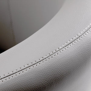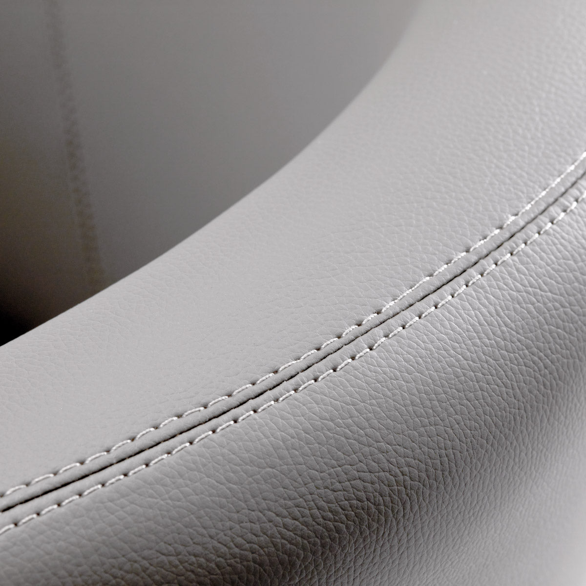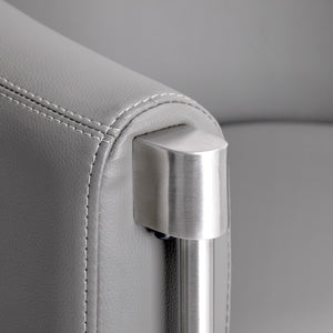 The chair is filled with foam, which is durable and does not deform, ensuring comfortable use for a long time. The upholstery is made of pleasant-to-the-touch imitation leather with a specific structure. Thanks to the use of such material, the equipment is resistant to moisture, durable and easy to clean. The covering in shades of grey and decorative elements in silver hues give it an expression of timeless elegance. Its distinctive classic finish makes it look great in almost any space.