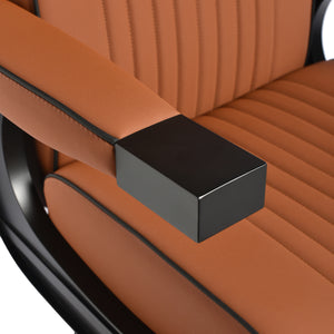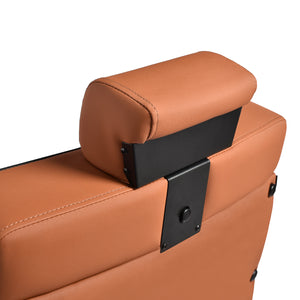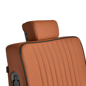 The black, round base ensures stability and durability. The soft, matte synthetic leather upholstery combines comfort with durability. The materials used are moisture-resistant, durable and easy to clean. Stylish stitching and brown-toned upholstery give it a unique character, perfectly complementing the décor of modern barbershops. The combination of the elegant upholstery colour with the black frame and base emphasises the modern, professional look of the chair.