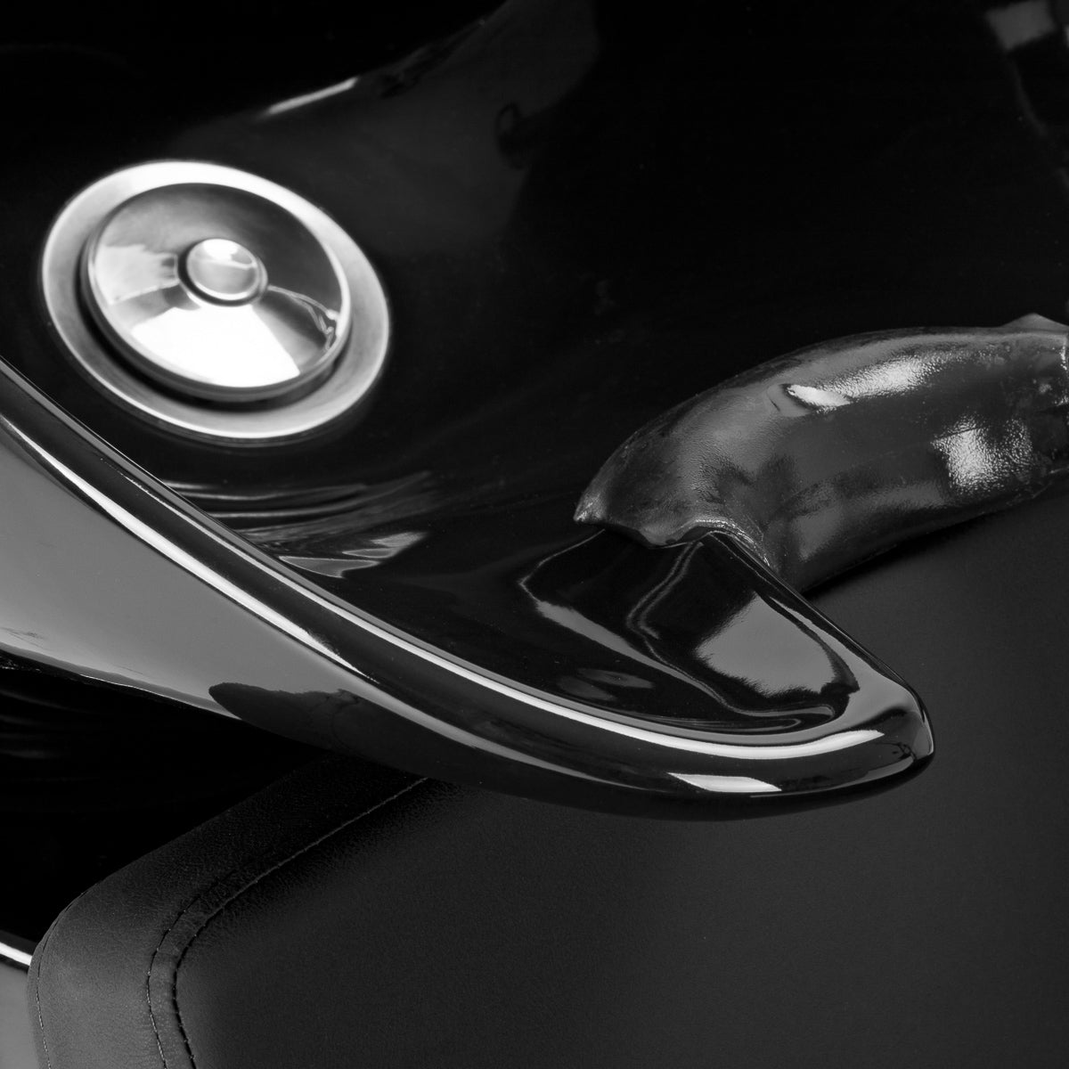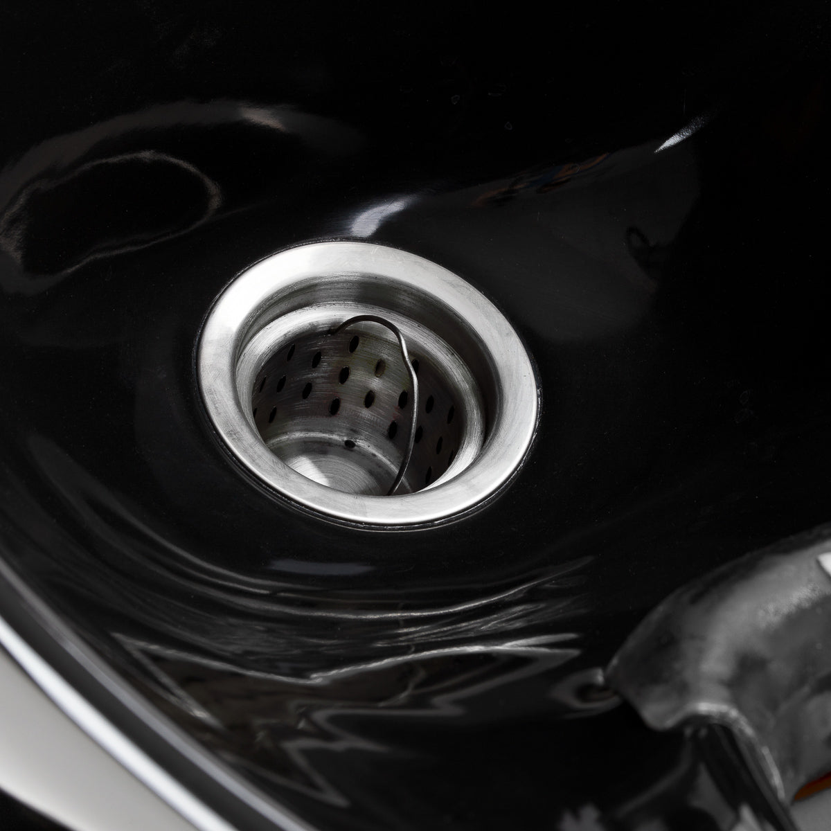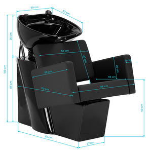 Den djupa keramiska skålen i svarta nyanser minimerar stänk av vatten och kosmetika under behandlingar. Skålens justerbara vinkel möjliggör exakt anpassning efter kundens behov. Den är tillverkad av slitstarkt material som är motståndskraftigt mot missfärgningar, repor och kemikalier, och dess släta yta gör den lätt att hålla ren. Den ergonomiskt utformade kragen ger bekvämt stöd för huvudet, och det svarta plastskyddet eliminerar känslan av kyla vid kontakt med keramiken.