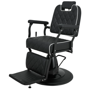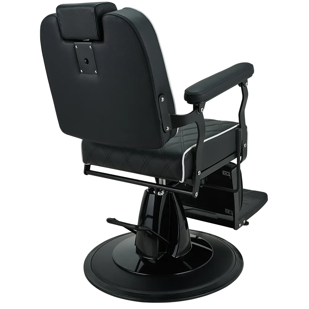 BRAVO barber chair Elegance in a minimalist spirit. A lightweight metal frame combined with black upholstery featuring geometric stitching and contrasting piping. Equipped with an adjustable backrest and a comfortable footrest, this chair ensures comfort for both the client and the barber. A great choice for modern barber and hair salons. Black upholstery