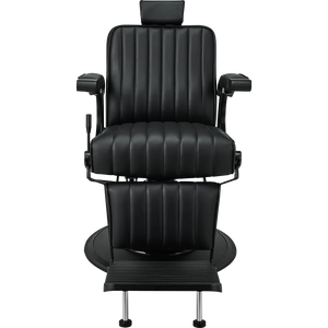 The perfect chair for the modern barber. Featuring black upholstery with vertical stitching, a matte black metal frame, adjustable headrest, reclining mechanism, and an upholstered legrest. Black upholstery with vertical stitching