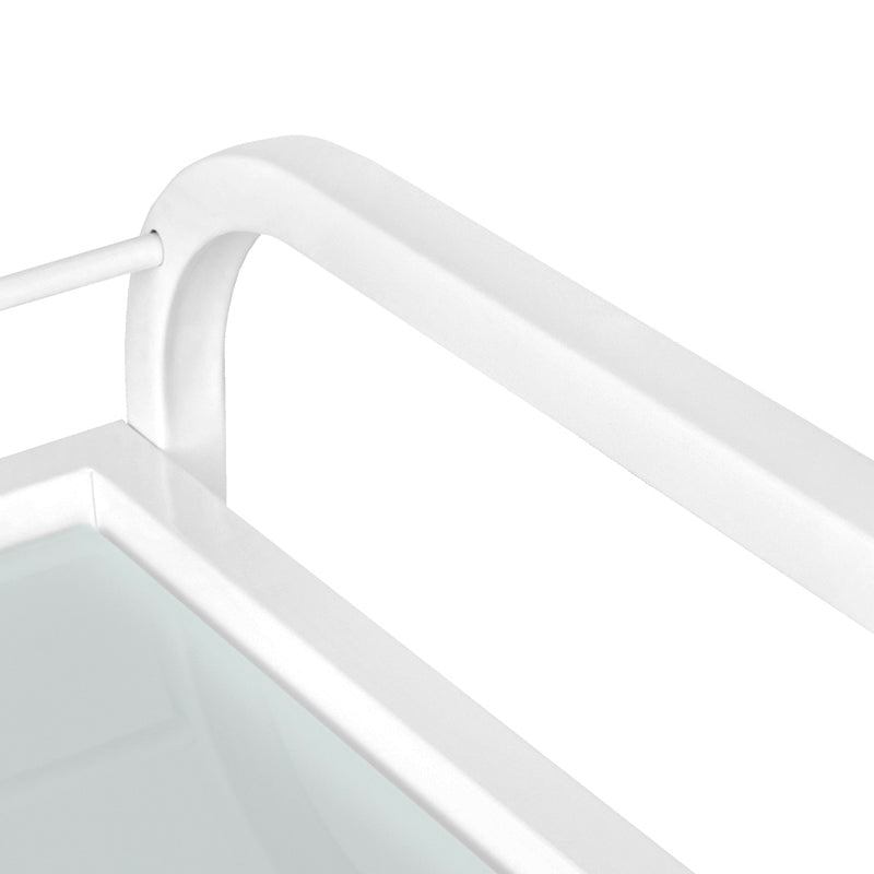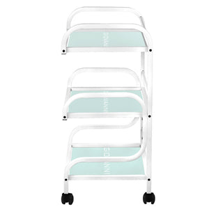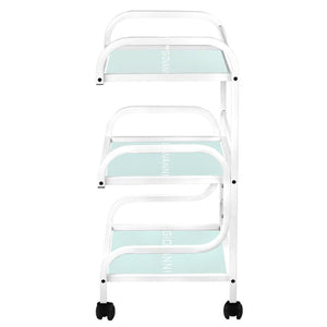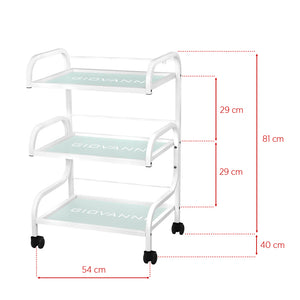 aesthetic table for cosmetic devices, made of metal and glass, with wheels. has three glass shelves with engraved giovanni logo.