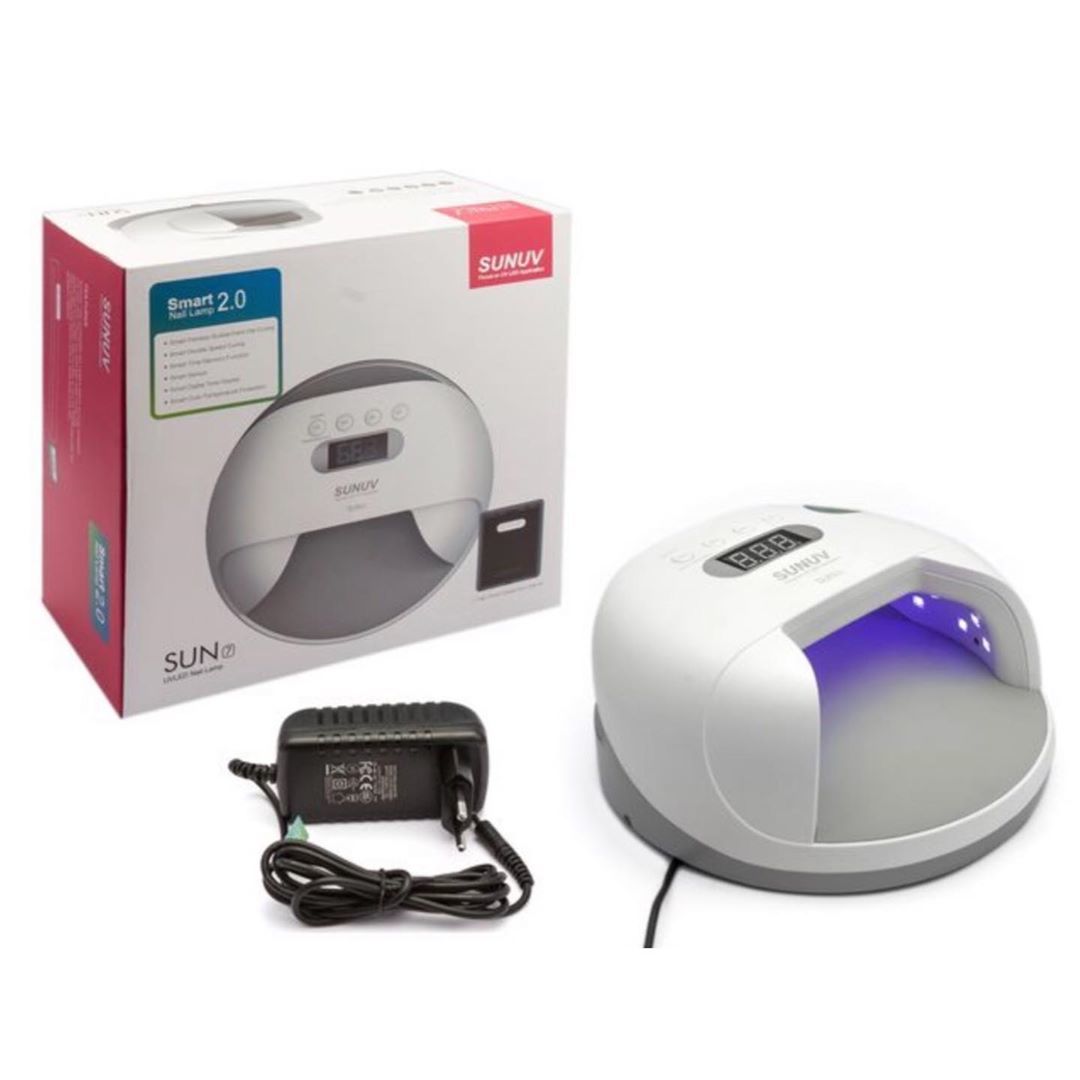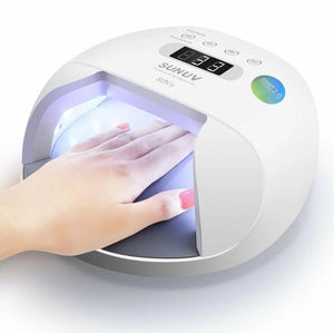 Professionell UV LED-nagellampa för torkning av gellack. Detta är en ny generations smarta UV LED-nagellampa med smarta funktioner: dubbel effekt, tidsminne, smart sensor, digital display och överhettningsskydd. Ljuset som avges av denna nagellampa skadar inte ögonen eller huden. SUNUV Sun 7 nagellampa är idealisk för användning både i hemmet och i skönhetssalongen.