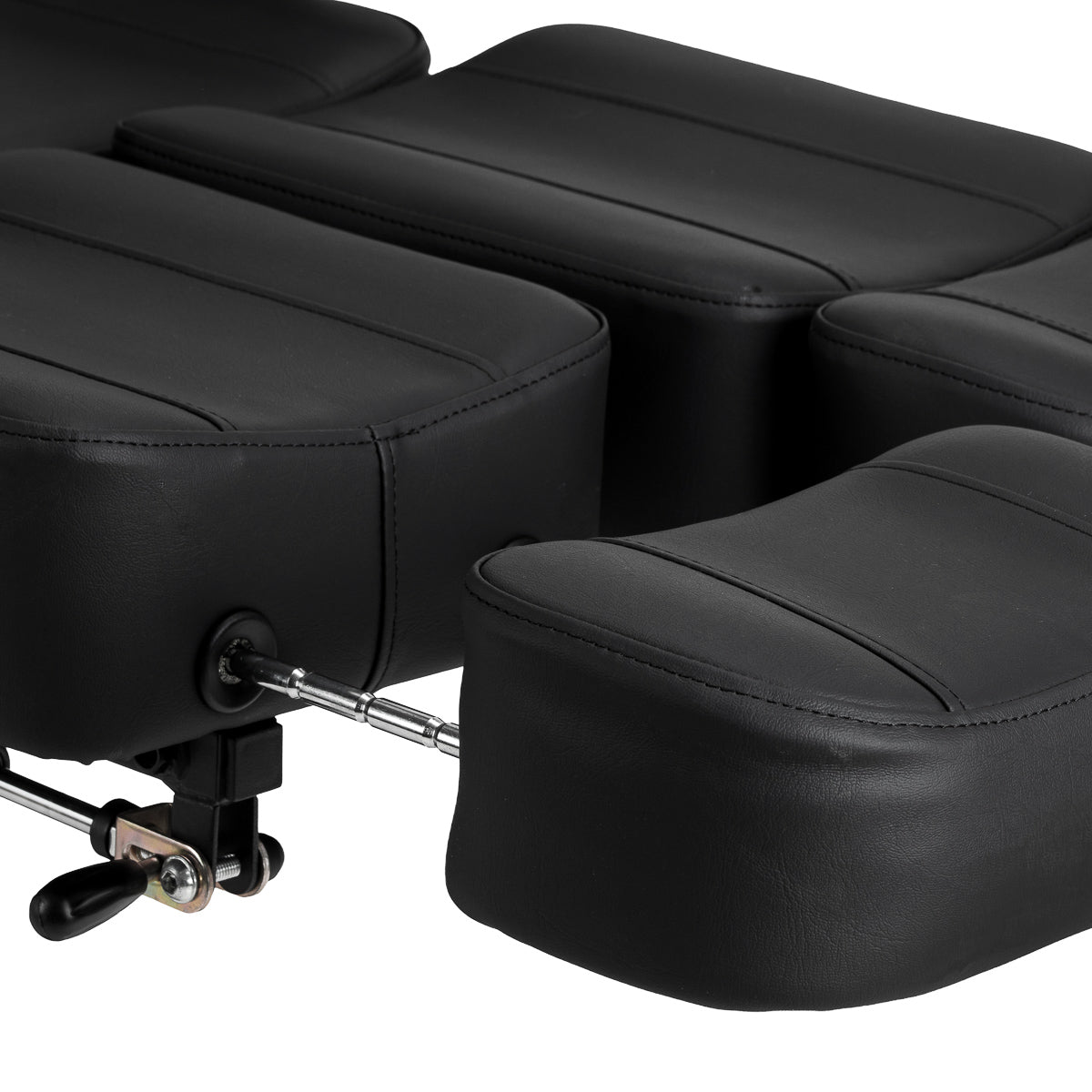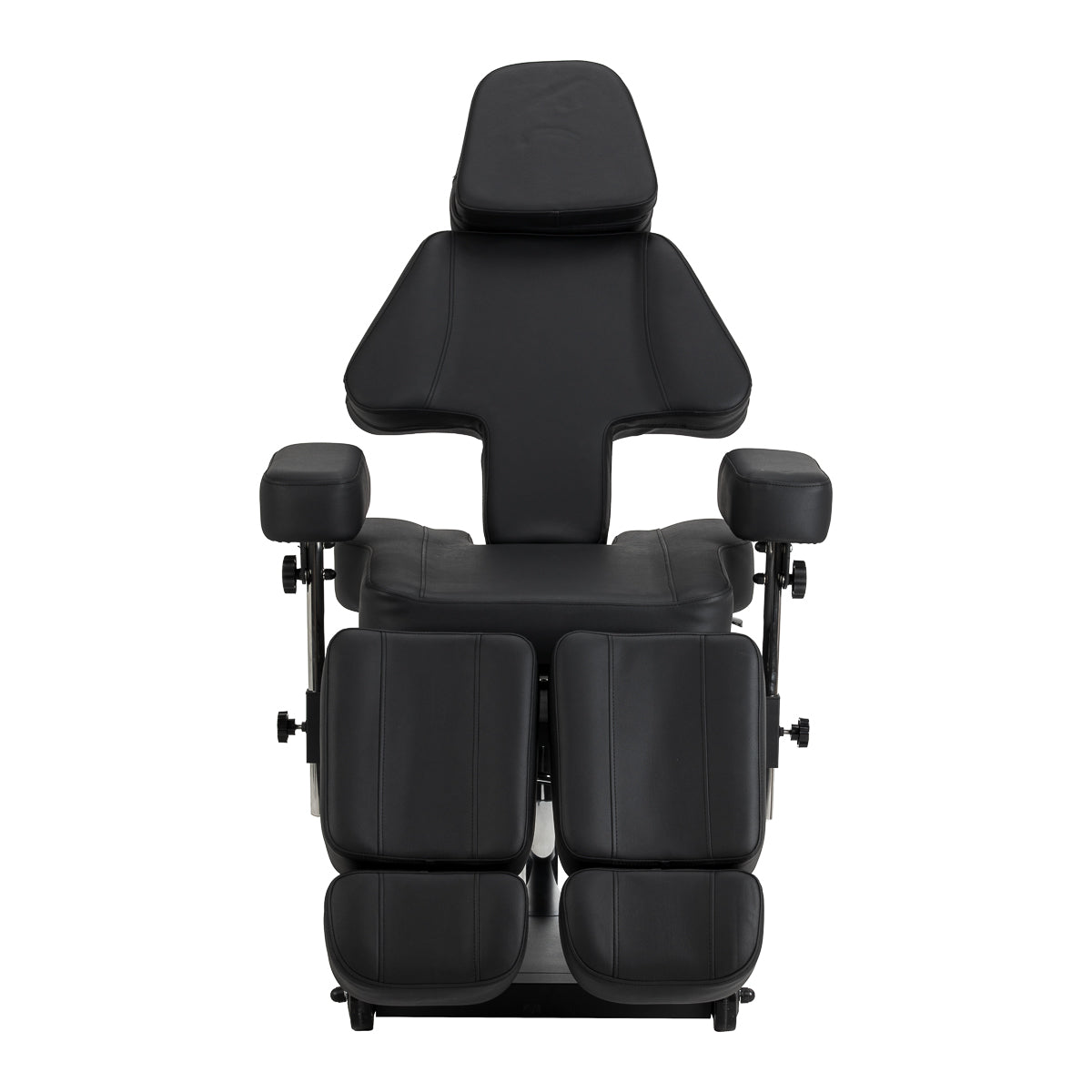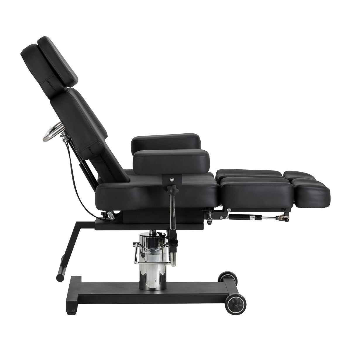 The seat height is adjustable by hydraulic lift in the range of 60-78 cm, while when fully extended, the chair reaches a length of up to 200 centimetres. Manual adjustment of the backrest and footrest angles allows you to adapt the position to the specific treatment being performed. The split footrest with independent segment adjustment and side adjustment allows for individual leg positioning, increasing freedom of movement and client comfort. The extendable part of the footrest provides stable support even for taller people. Removable armrests with height and angle adjustment increase the number of possible settings, making it easier to adjust the chair to current needs. The whole creates an ergonomic and functional solution, perfectly suited to the realities of working in a professional tattoo studio.