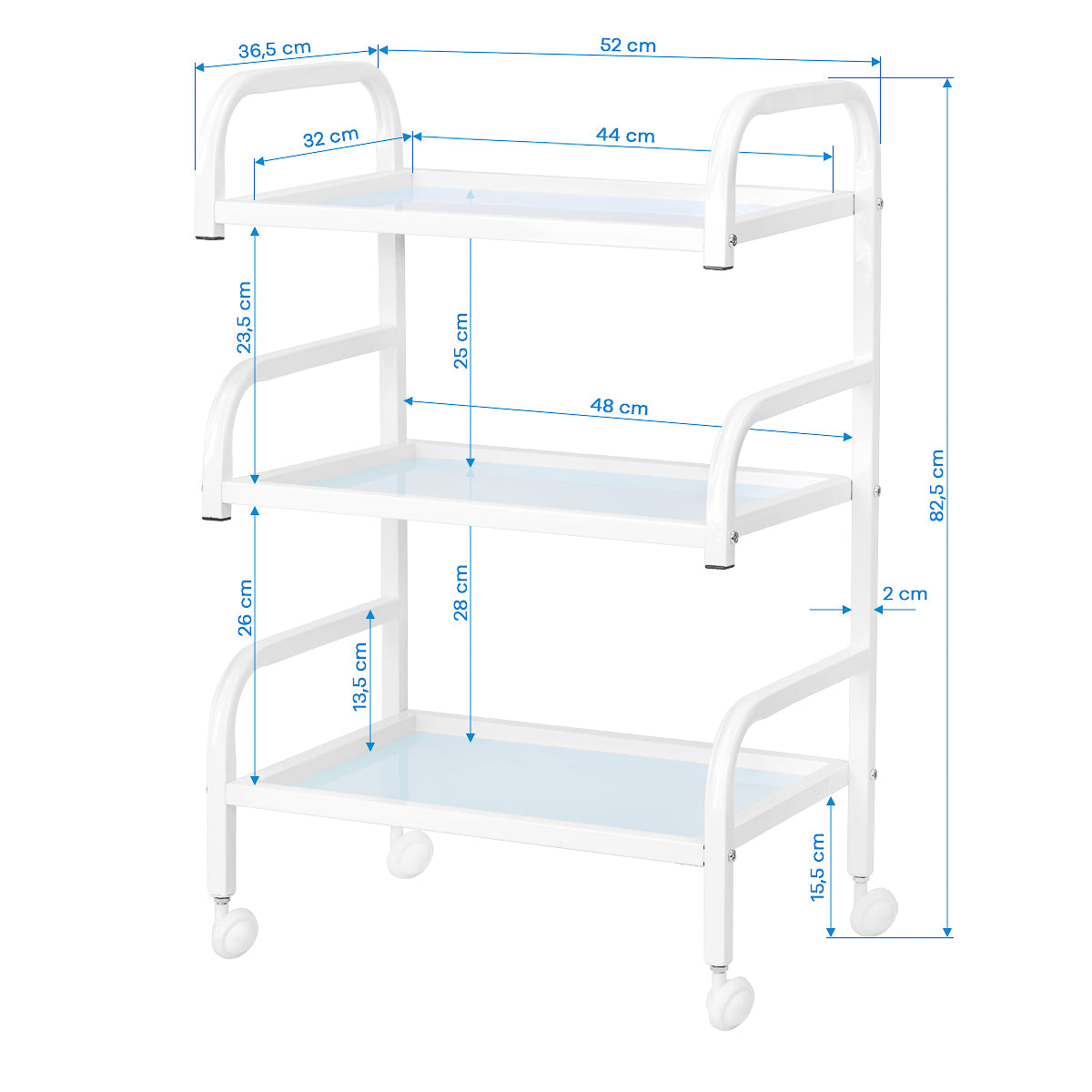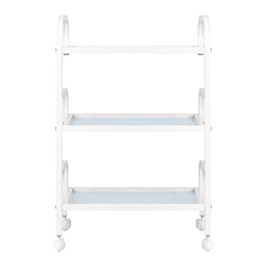 The frame made of durable aluminum in shades of white and the glass shelves create a modern and aesthetic whole that is easy to keep clean. Four wheels ensure mobility for easy organisation of the workspace, while solid materials guarantee stability and durability of use.