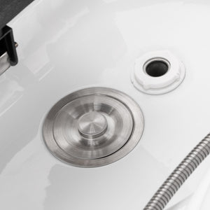 The car wash is equipped with a mixer faucet, making it easy to adjust the temperature to the client's preference. A dedicated place for the shower handset makes work easier, and a chrome-plated plug with a special strainer allows you to control the flow of water and maintain high standards of hygiene in the salon. The water connection is hidden inside the housing behind a cover made of flexible material, which allows to aesthetically conceal the plumbing and maintain a consistent, professional appearance of the device.