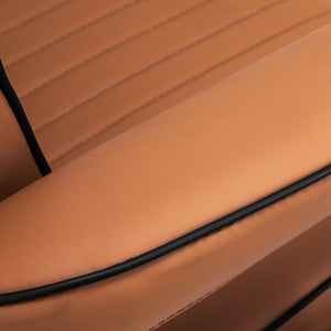 Sturdy base construction ensures stability and high comfort. The seat is filled with deformation-resistant foam and upholstered with soft, matt synthetic leather, combining durability with comfort. The materials used for the finish are moisture-resistant, durable and easy to clean, making the chair perfect for everyday use. Stylish stitching and upholstery in shades of brown give it a unique character, blending perfectly with the décor of modern barbershops.