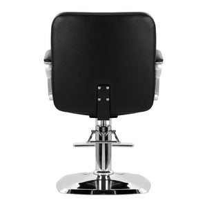 The solid base ensures stability during use, and its mirror-finish surface is easy to keep clean. The comfortable seat is filled with durable foam to ensure high comfort of use, even during many hours of treatments. Partially upholstered armrests are a visually interesting element, and thanks to appropriate shaping, they allow for the correct positioning of the customer's shoulders. Thanks to this, he does not hide his head in his shoulders or slouch – which makes it much easier to perform precise procedures, including haircuts. Equipping the chair with a full rotation mechanism makes the hairdresser's work more effective and comfortable.
