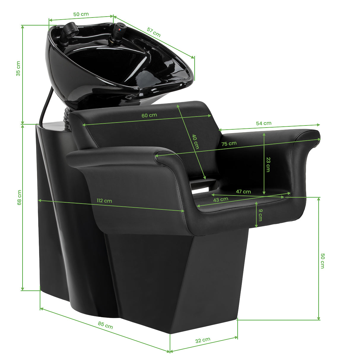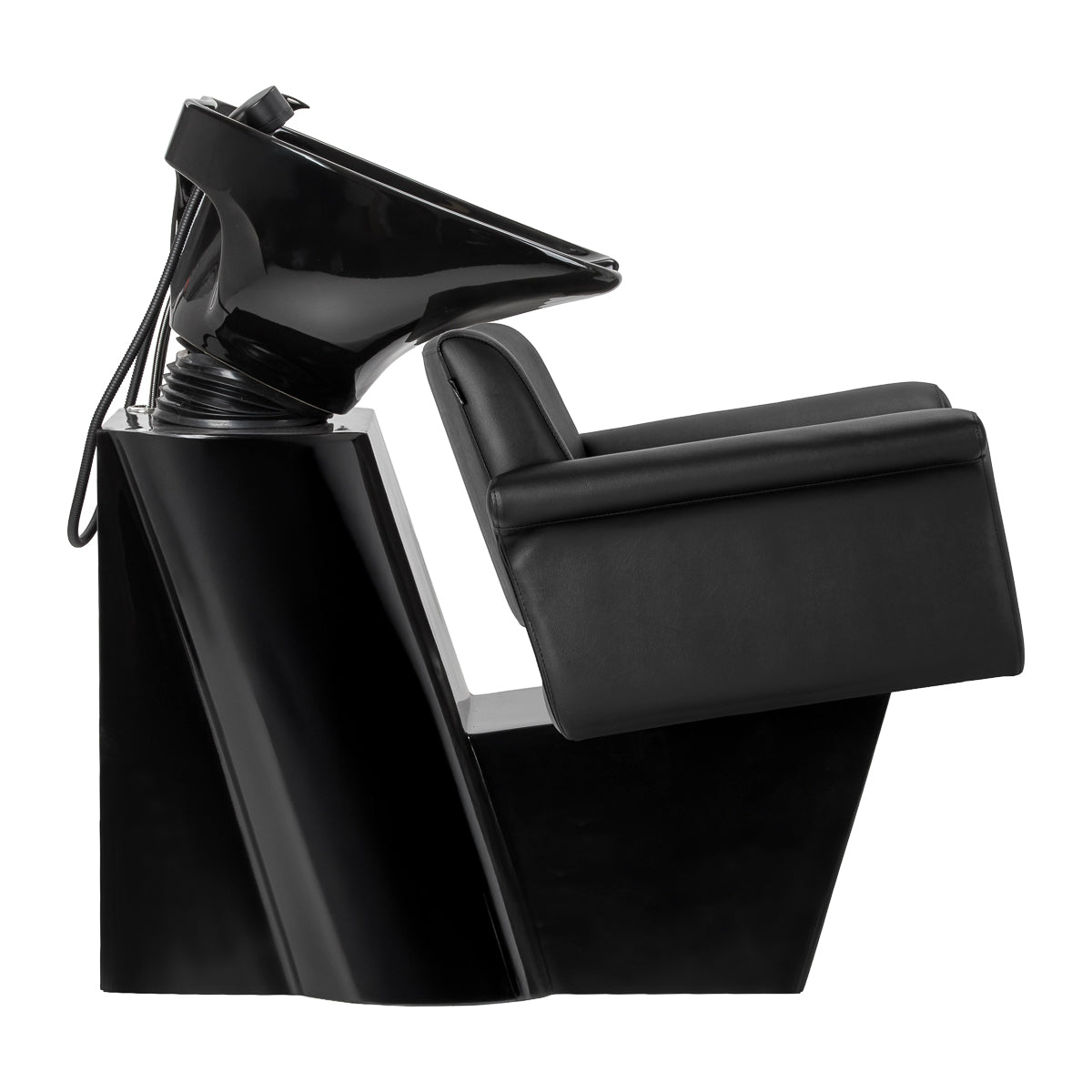 The chair combines a modern, minimalist form with a high level of comfort. The characteristically outward-curving armrests lend it an elegant character, whilst supporting a comfortable and natural position for the client. The backrest, with its optimal angle of inclination, promotes correct posture and relaxation during treatments. The use of durable, moisture-resistant materials makes it easy to maintain and ensures the furniture retains its aesthetic appeal for a long time. A complete set of fittings – tap, shower head and dedicated hoses – ensures the unit is fully ready for use. The universal design means the model fits perfectly into both modern and classic interiors, emphasising the professional character of the salon.