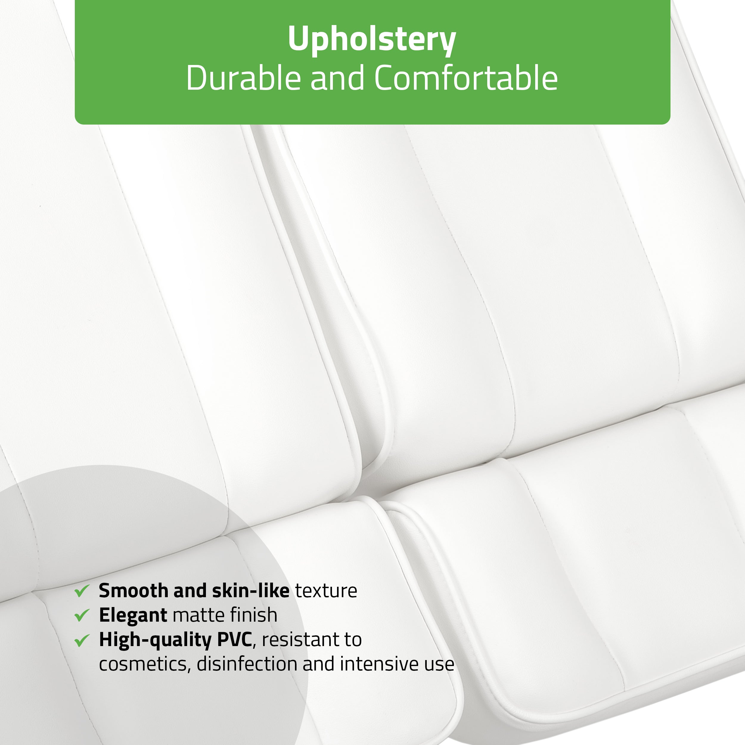 High-quality PVC upholstery: stain-resistant and easy to clean. Available in two colors: Bianco (white) and Nero (black).