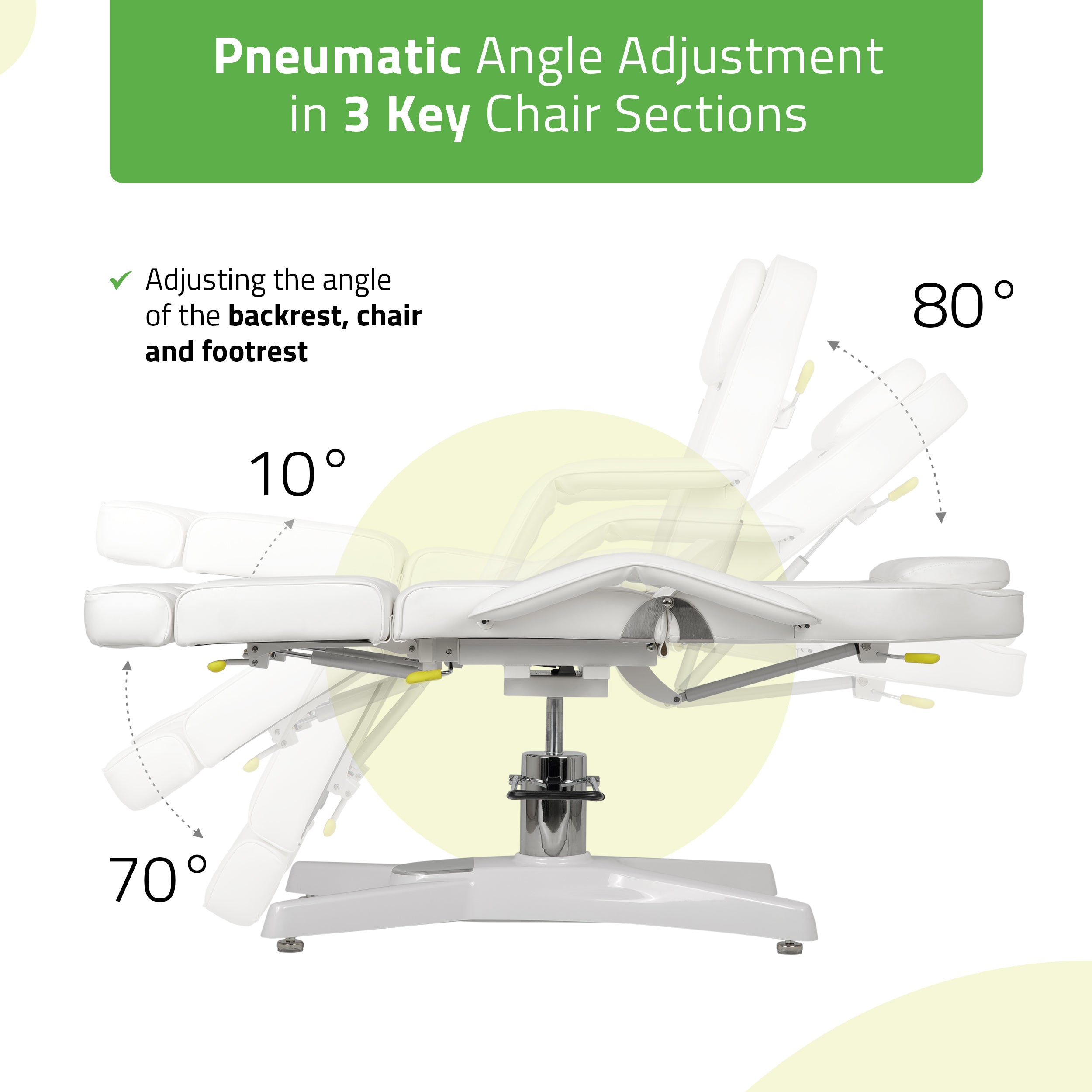 Pneumatic adjustment of the overall tilt angle (0°–10°): extra reclining options for client comfort.