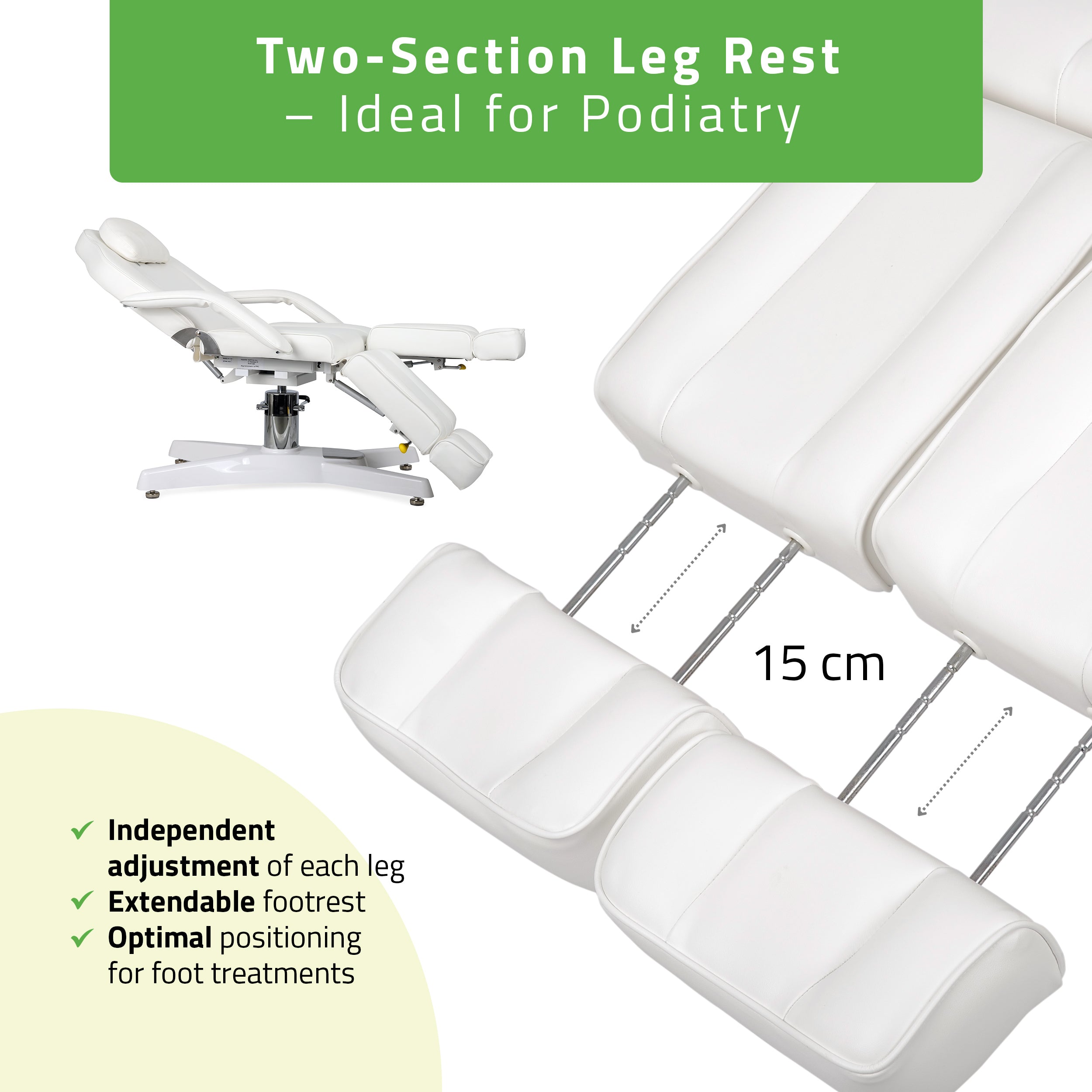 Extendable leg sections with separate adjustment for each section: ideal for podiatry treatments, enabling one leg to be raised independently.