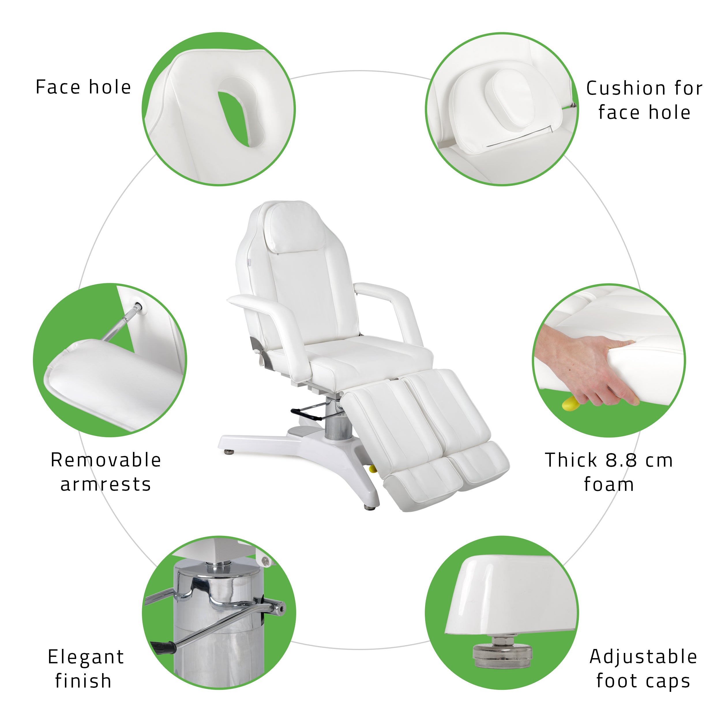 Ergonomic face hole with cushion: added comfort for lying treatments or facial massage.