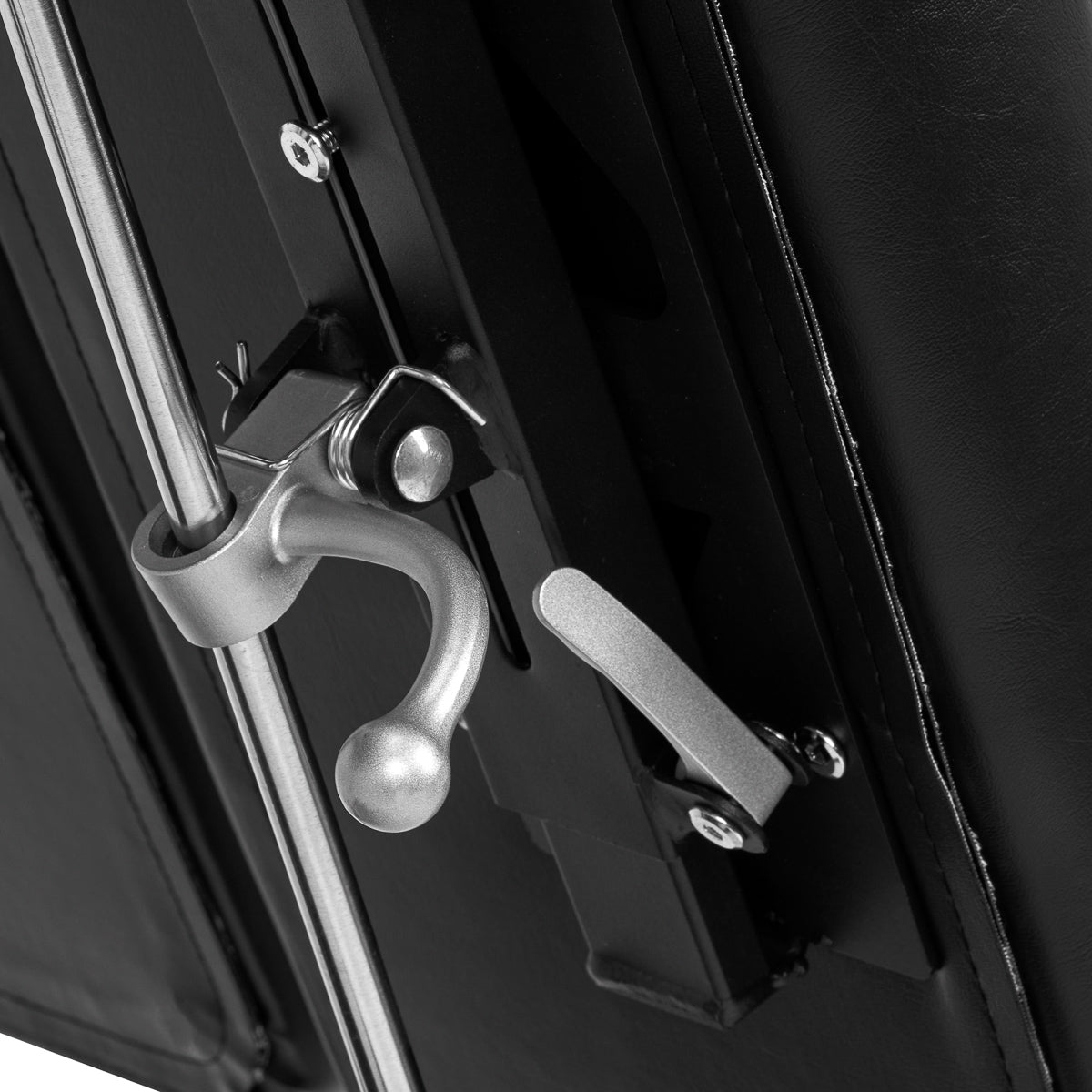 The simple, minimalist look and classic colors make the chair perfect for any tattoo salon, significantly improving the comfortable performance of services. The functional chair makes it easier to adopt a comfortable position for both the tattooed person and the artist. The padding with deformation-resistant foam, covering with pleasant-to-the-touch synthetic leather in shades of black and a stable metal frame ensure durability and easy cleaning of the equipment. The aesthetic, simple stitching gives it a unique character. Wheels placed in one part of the base make moving the furniture much easier.