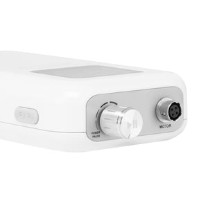The knob allows for smooth adjustment of the speed of the head, reaching up to 35,000 revolutions per minute, allowing for easy customization and comfort during different treatments. Pressing the knob allows you to immediately stop and resume the device (pause function), which gives you full control over the workflow. Practical buttons located on the sides allow quick switching to the foot drive and changing the direction of rotation, which additionally makes it easier to adapt the device to various services. The display shows information about the direction of rotation, battery status, foot drive activation, and active pause. Additionally, the device is equipped with overload protection, which protects the motor from overheating, ensuring greater safety of work and longevity of the equipment.