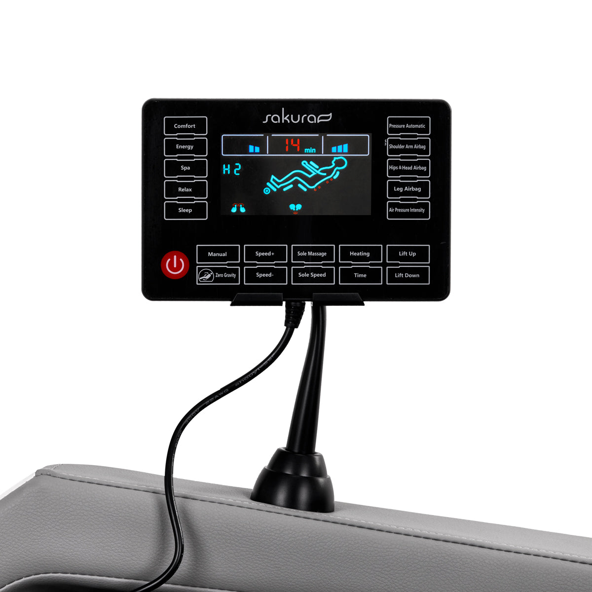 The furniture is equipped with an easy-to-read control panel with an LCD screen that can be placed on the handle mounted on the right armrest or held in the hands. This makes operating the chair intuitive and comfortable. The LCD screen displays information about the current operation of the device, including the body area being massaged, massage intensity, treatment time and the selected program. The panel allows you to freely adjust the chair settings and select the massage mode. It also allows you to adjust the session duration, with options of 5, 10, 15, 20, 25 or 30 minutes.
