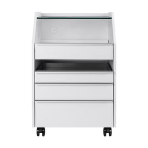 Practical castors facilitate the smooth movement of the cabinet. The simple, minimalist form in white gives the furniture a universal, professional look that fits well into modern interiors. The design, created with podiatry professionals in mind, provides a dedicated space for a podiatry drill and essential accessories, promoting comfortable and ergonomic work during procedures.