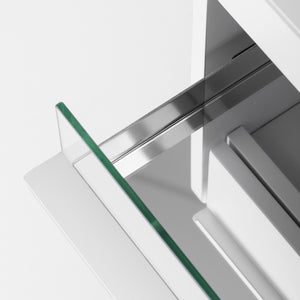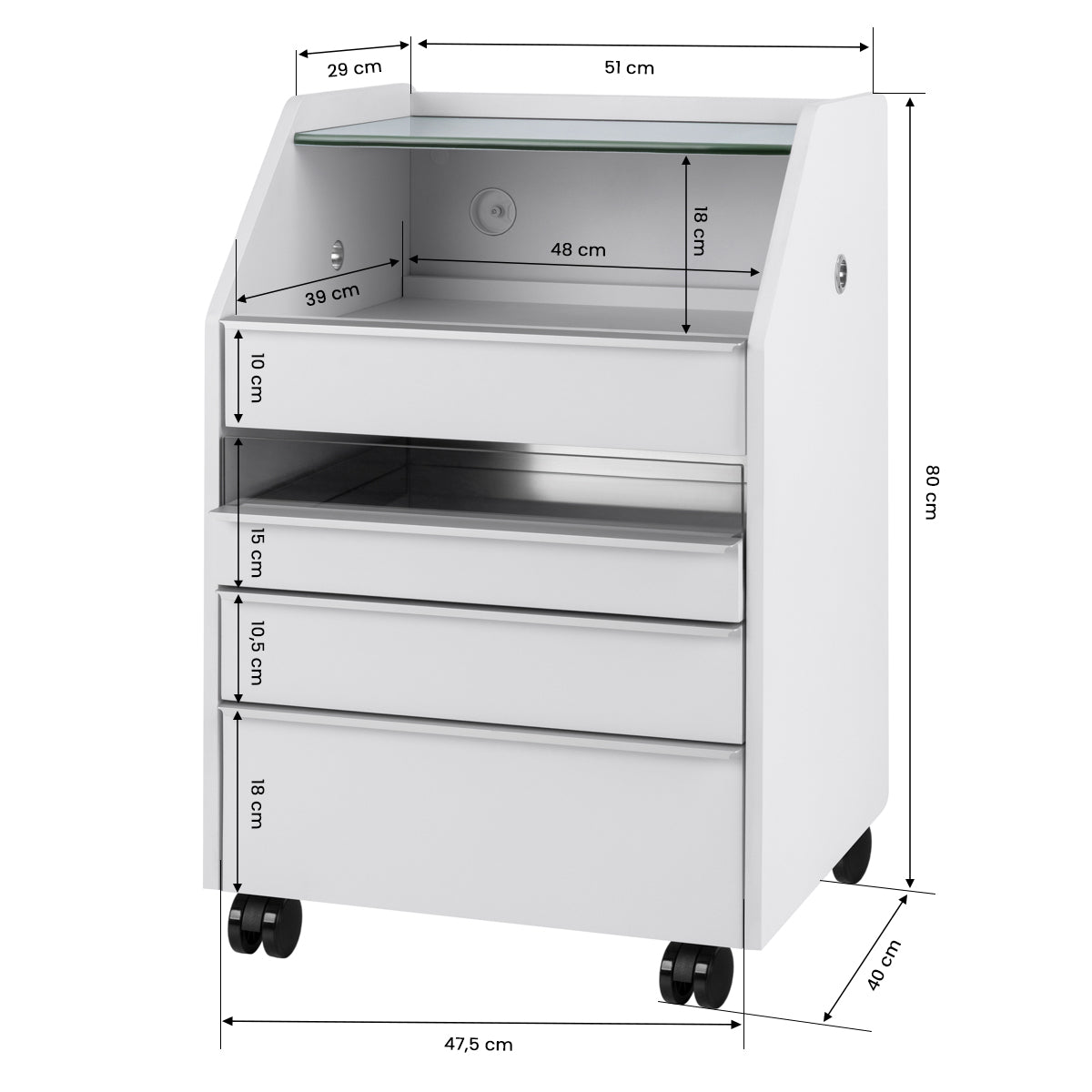 The narrow upper glass shelf allows for convenient storage of the most frequently used accessories. The cabinet is equipped with four drawers of various sizes, which facilitates the orderly storage of tools and cosmetic products. The mirrored bottom of one of the drawers and a dedicated internal organiser facilitate better organisation of tools, ensuring quick access to essential accessories and increasing comfort during treatments. The height of the upper open drawer allows you to place essential equipment, such as a nail drill with an absorber.