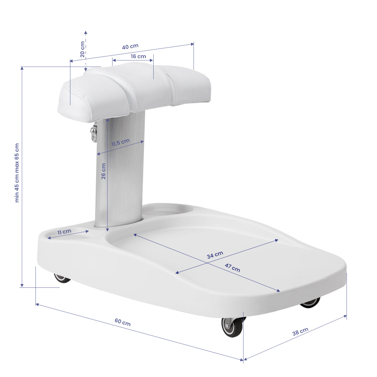 Fotstödet består av tre delar, varav den mellersta är utdragbar. Manuell höjdjustering gör att den kan höjas med maximalt 20 cm. Alla delar av fotstödet är klädda med konstläder, vilket säkerställer motståndskraft mot fukt och enkel rengöring. Som ett resultat kan vagnen anpassas till användarens individuella behov, vilket gör den till en utmärkt lösning för både kosmetiska och medicinska fotvårdsbehandlingar, vilket garanterar komfort och precision i arbetet i olika positioner.