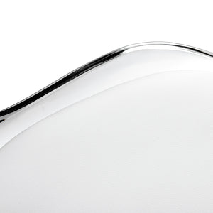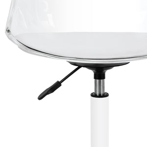 Modellen fångar blicken med sitt slående, transparenta ryggstöd, vilket ger helheten en lätt och modern karaktär. Kombinationen av den transparenta strukturen med sittdynan klädd i vitt konstläder och den vita basen skapar en sofistikerad kontrast som framhäver elegans. Detta gör stolen till inte bara en funktionell möbel, utan också en stilfull dekoration för kontoret. Den smälter perfekt in i alla interiörer och passar utmärkt med estetiken i samtida skönhetssalonger.