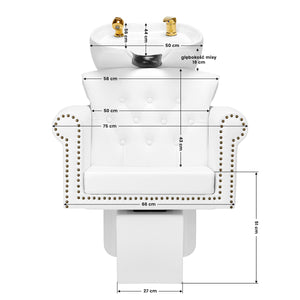En korrekt profilerad stol fylld med slitstarkt skum ger adekvat stöd och därmed hög användarkomfort. Armstöden möjliggör rätt positionering av kundens axlar. Det behagliga konstlädret i vita nyanser säkerställer långvarig hållbarhet och enkel rengöring. Den originella, eleganta designen på schamponeringen med dekorativ kviltning och guldinslag ger interiören ett unikt uttryck. Setet innehåller kompletta armaturer i guldnyanser, inklusive blandare, duschhandtag och dedikerade slangar för att erbjuda en komplett uppsättning verktyg för arbete.