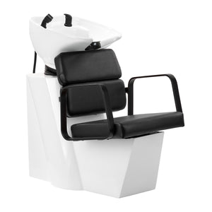 Det lämpliga djupet på den vita keramiska tvättställsskålen förhindrar överdrivet stänk av vatten eller produkter som används under behandlingar. Detta möjliggör ett bekvämt och effektivt utförande av ett brett utbud av tjänster. Skålens vinkel kan justeras, vilket gör det enkelt att anpassa efter individuella behov. Den höga kvaliteten på de använda materialen gör tvättstället hållbart, motståndskraftigt mot missfärgning och repor samt mycket lätt att rengöra. En korrekt profilerad krage och lutande ryggstöd ger stöd och komfort vid hårtvätt, och tack vare det bekväma svarta plastöverdraget kommer kunden inte att känna obehaget av den kalla keramiska ytan.