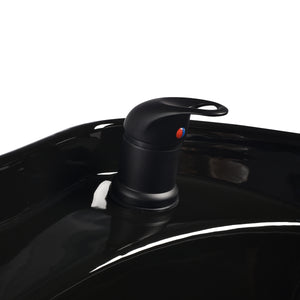 Det lämpliga djupet på det vita keramiska tvättstället förhindrar överdrivet stänk av vatten eller produkter som används vid behandlingar. Detta möjliggör ett bekvämt och effektivt utförande av ett brett utbud av tjänster. Tvättställsskålens vinkel kan justeras, vilket gör det enkelt att anpassa efter individuella behov. Den höga kvaliteten på de använda materialen gör tvättstället hållbart, motståndskraftigt mot missfärgning och repor samt mycket lätt att rengöra. En korrekt profilerad krage och lutande ryggstöd ger stöd och komfort vid hårtvätt, och tack vare det bekväma svarta plastöverdraget slipper kunden obehaget av den kalla keramiska ytan.