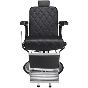 En modell designad för älskare av moderna interiörer. Elegant barberarstol med diamantmönstrad svart klädsel, justerbart nackstöd och fotstöd i rostfritt stål. En solid bas säkerställer stabilitet och komfort vid daglig användning. Svart klädsel
