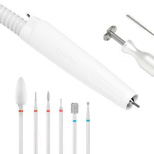 De praktiska tillbehören som ingår underlättar arbetet effektivt. Ett precisionshandstycke med utsug och utbytbara filterpåsar säkerställer säker användning och skyddar mot inandning av skadliga patogener. Setet innehåller även ett urval av fräsar som möjliggör bekväm pedikyr, samt ett ställ för dessa i ett specialmaterial som är lätt att rengöra. Olika former och material på fräsarna gör att du kan välja rätt verktyg för varje specifik behandling. Medföljande verktyg för rengöring av handstycket och demontering av fräsar säkerställer enkelt underhåll av enheten.